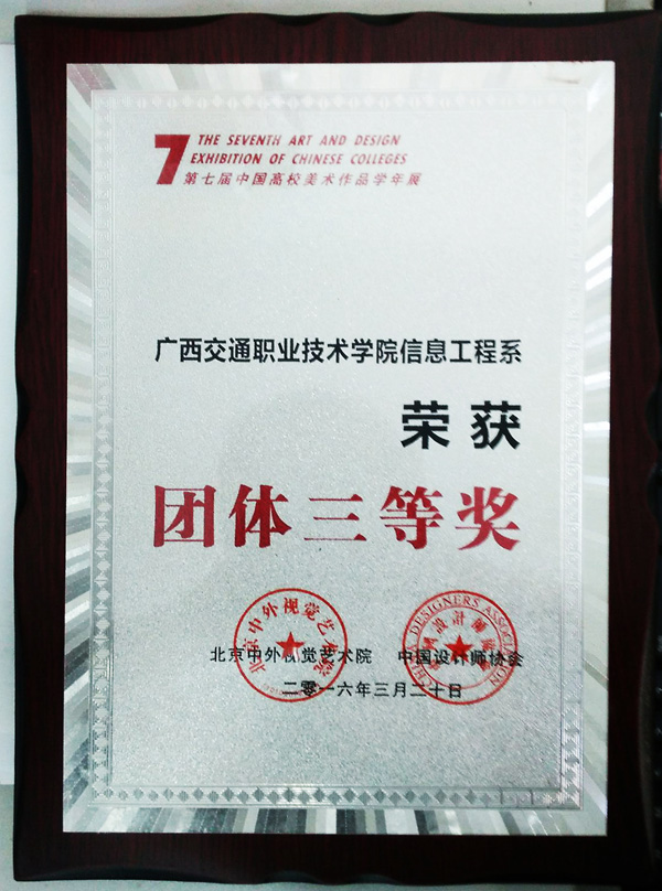 本次比赛,全国千余所高校投稿参加,共计参赛作品9532件,获奖率约为7%,获奖作品充分代表了当前高校美术与设计创作的最高水准,堪称全国高等院校美术与设计界的国展、国赛。此次比赛,我院信息工程系获团体三等奖,是全国唯一一所非艺术类专业高职院校获此殊荣。