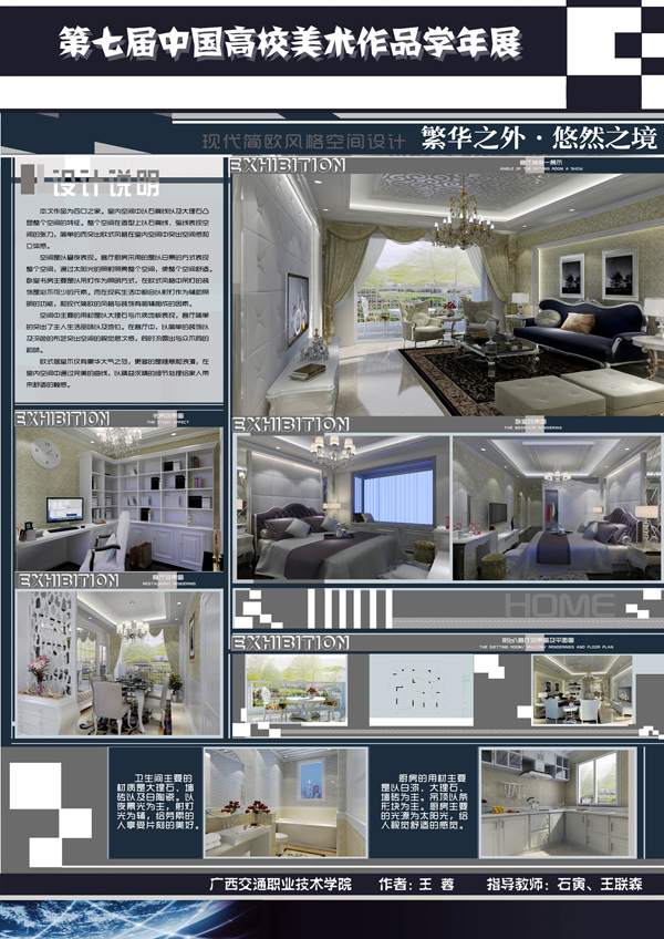 我院选手与全国各高校的在校研究生、本科生及高职生同台竞技,最终莫连基同学的室内设计作品《混搭风之风尚雅居》获大学组二等奖,王蓉同学的室内设计作品《现代简约——庭院居室》获大学组三等奖,潘科成、秦懿、谢嘉俊等9名同学获优秀作品奖。参与指导的石寅、王联森、罗源三位老师获得优秀指导老师称号。