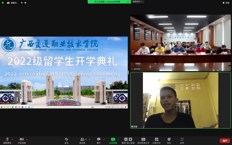 (东盟国际学院 讯 )10月28日,2022级国际学生开学典礼在园湖校区信息大楼707教室举行,来自巴基斯坦、东帝汶、柬埔寨等16个国家的73名国际学生、15名在校的国际学生分别在线上、线下参加了此次开学典礼。校长李文勇出席活动并发表致辞,学校学生工作处处长邱文成、教务处副处长肖铭、东盟国际学院院长莫小农及全体教师参加此次典礼。活动还邀请了印度尼西亚双木丹物流高中校长苏塔尔曼先生出席。