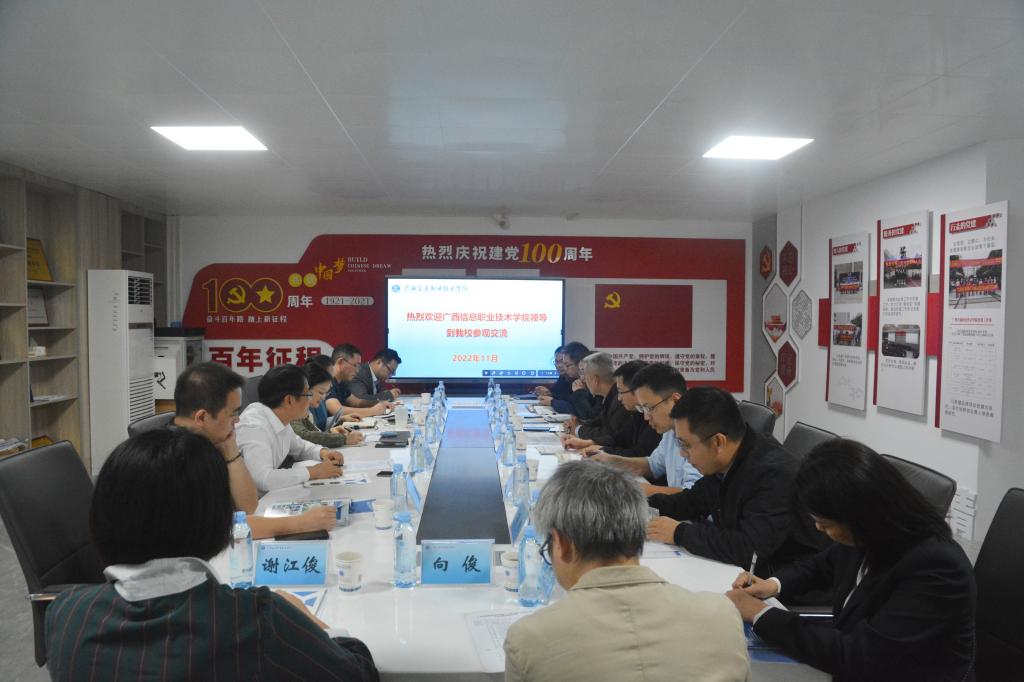 11月18日上午,广西信息职业技术学院副院长黄河、副院长邓明学、校长助理陈广杰一行10人来PP电子调研交流就业创业、教学管理、专业建设等工作。学校招生就业处、教务处、经济管理学院、交通信息工程学院与土木建筑工程学院负责人参加了此次交流活动。