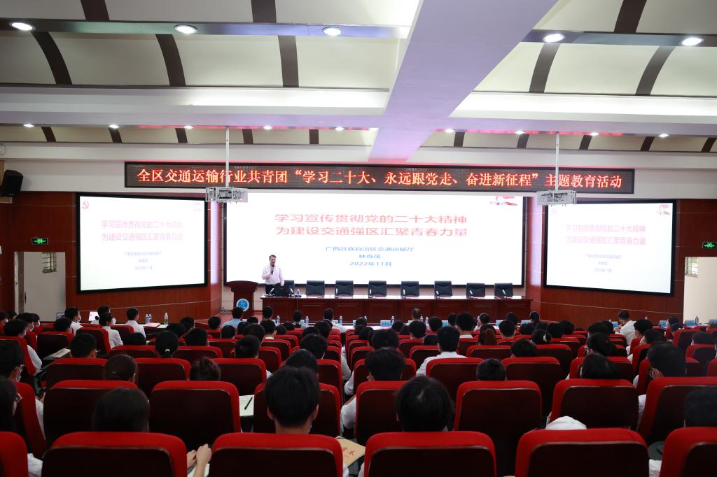 自治区交通运输厅二级巡视员林奇茂以《学习宣传贯彻党的二十大精神,为建设交通强区汇聚青春力量》为主题,从深刻领会党的二十大工作报告精神核心要义和丰富内涵,在新征程上以赶考姿态践行“请党放心、强国有我”的青春誓言以及以党的二十大精神为引领,加快建设交通强区三个方面进行专题授课,为现场青年团员上了一堂生动、深刻的团课,他带领全体团员青年重温习近平总书记在党的二十大开幕会上的重要讲话,深入学习贯彻党的二十大精神。他指出,当前,全区交通运输行业持续掀起学习宣传贯彻党的二十大精神热潮,全体团员青年要全面学习大会精神,深入领会核心要义,准确把握实践要求,积极响应永远跟党走、奋进新征程,以习近平新时代中国特色社会主义思想武装头脑,不断提高思想认识,坚定理想信念,提高业务技能,切实将学习成果转化为加快交通强区建设的不竭动力,为实现“全国前列、西部领先”的“交通大省”目标贡献青春力量。