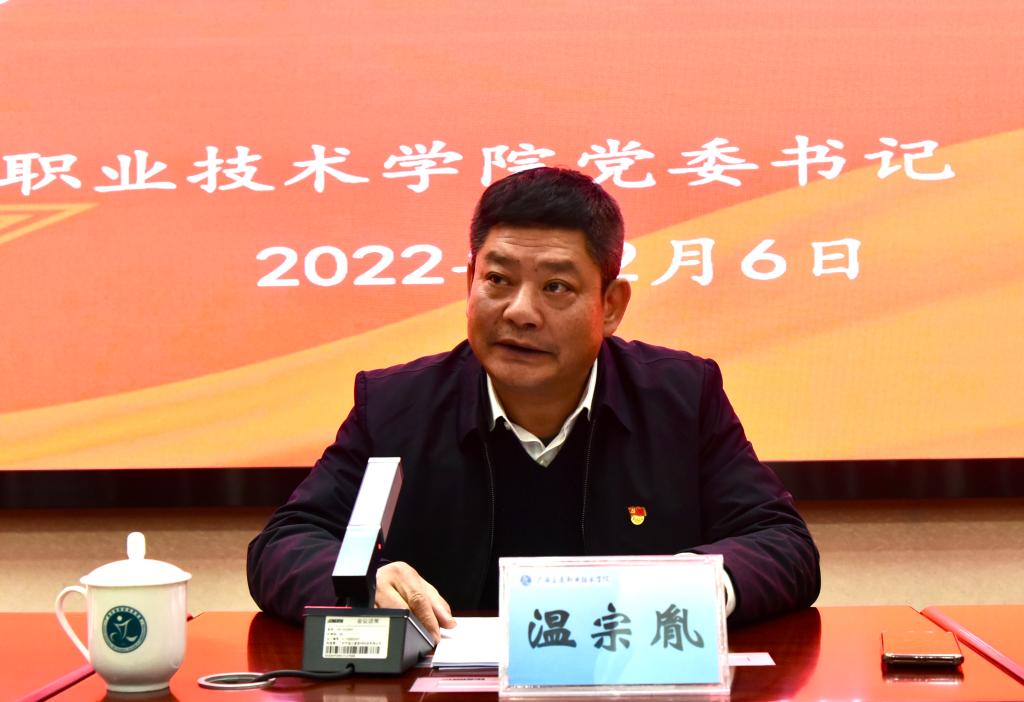 温宗胤书记强调,在接下来的工作中,我们要以党的二十大精神为指引和遵循,进一步增强责任感和使命感,坚定不移沿着习近平总书记指引的方向奋勇前进,主动服务广西“交通强国”试点、西部陆海新通道、平陆运河建设等国家重大战略,紧紧抓住广西和教育部省部共建、共同推进广西教育高质量发展的重要机遇,踔厉奋发,勇毅前行,以双高建设为牵引,紧扣凸显“高”、彰显“强”、体现“特”的目标,对标对表、系统推进学校改革与建设,团结奋斗把以人为中心的内涵建设转化为“争国家双高 创职业本科”的强大动力,在新时代新征程上,续写新的历史篇章、创造新的时代辉煌!