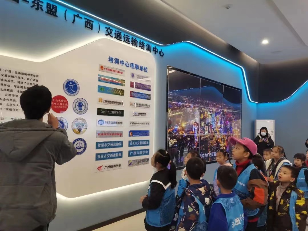 南宁园湖路小学、丹桥小学、“小小轨道工程师”亲子研学营、八桂小记者研学团等入校研学,体验交通科技带来的新鲜与乐趣。广西综合交通运输科普基地交通科普馆,能让学生们通过参观各个展区,学习城市交通多式联运枢纽、轨道交通的运行及监控、船舶航海的发展历史。轨道交通运行实训中心,能让孩子们体验地铁运行的操控技术,参加研学的孩子们兴奋地坐上虚拟地铁操控台,一边模拟司机驾驶,一边向讲科普使者询问各开关按钮的功能。参与研学的孩子们仿佛越过了那块“乘客止步”的牌子,走进了神秘的地铁后台控制中心。