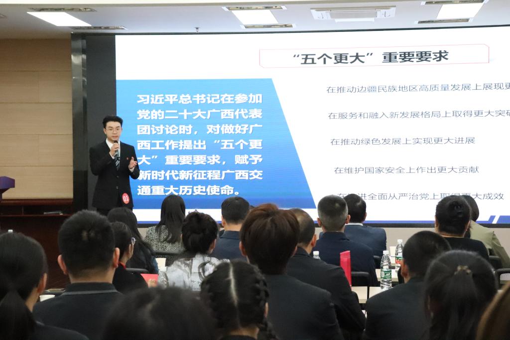 雷杰同学以《青春勇担当,做中国式现代化的“开路先锋”》为主题,认真讲述了党的十八大以来,广西交通运输取得的巨大成就,作为新时代交通院校学子立志用实际行动服务交通发展的青春故事。