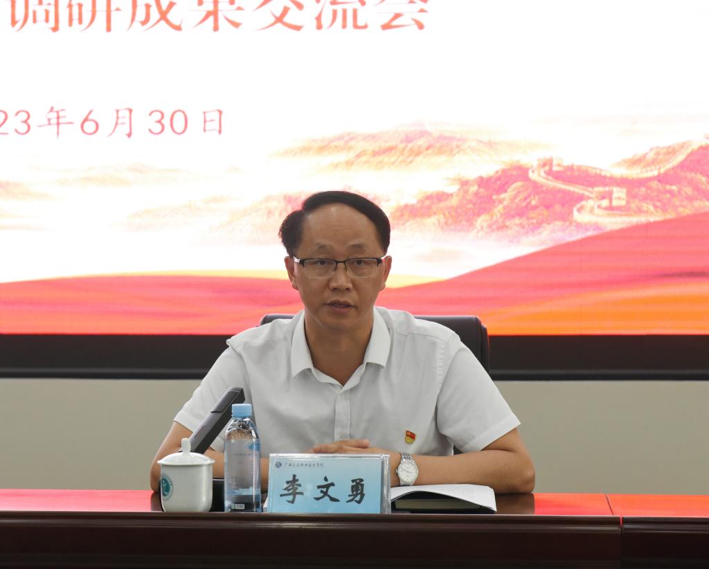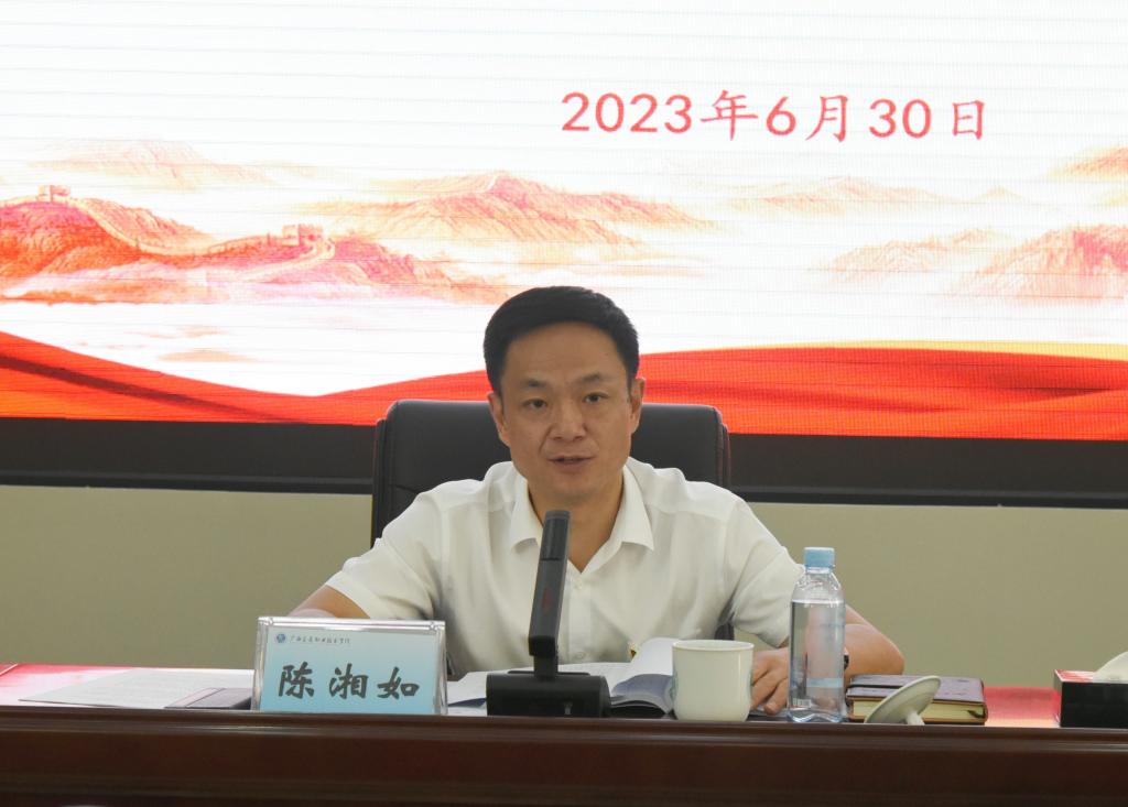 6月30日上午,学校在园湖校区四楼会议室召开学习贯彻习近平新时代中国特色社会主义思想主题教育调研成果交流会,学校党委书记陈湘如、校长李文勇、党委副书记莫海燕、副校长陈海峰、纪委书记麻新桃出席会议。自治区党委主题教育第十四巡回指导组成员韦震华、李芳云到会指导。