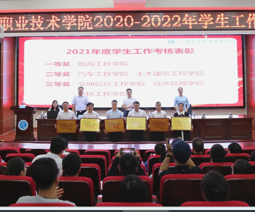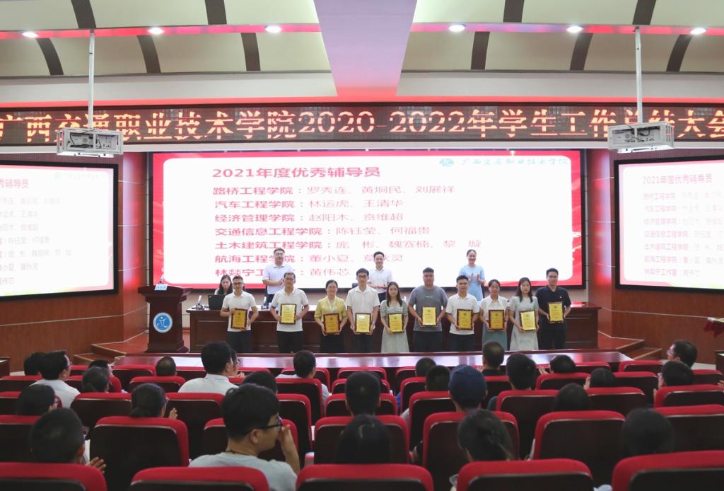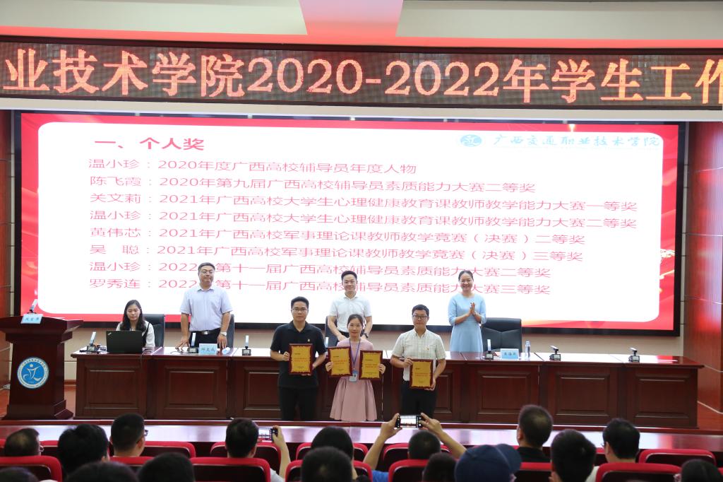 会上,学校党委副书记莫海燕宣读了2020—2022年期间获学生工作获自治区、校级集体奖和个人奖名单,为学生工作、共青团工作考核获奖集体、优秀辅导员进行了现场颁奖。