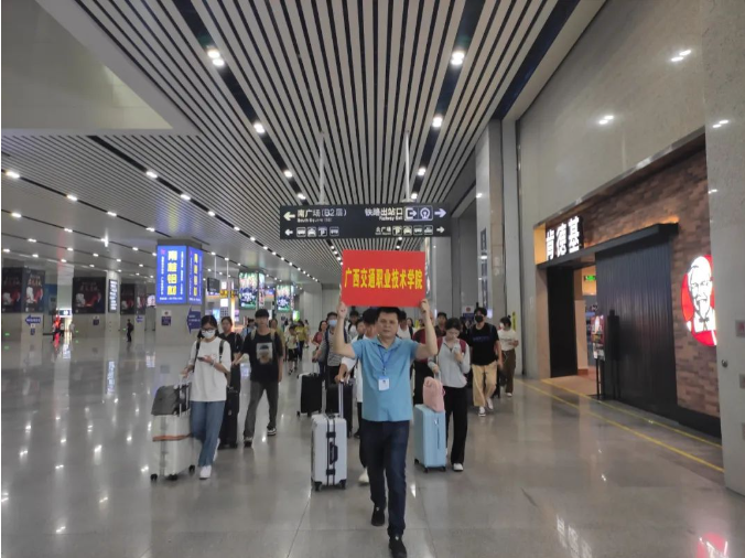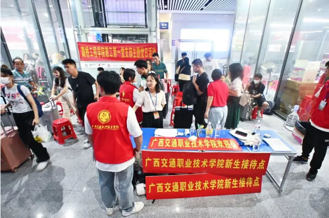 学校提前在南宁市各主要交通站点设立迎新接待站,志愿者早上6点半在园湖校区集合出发,7点30分之前全部到达各车站。路桥工程学院“领路人”团队党员老师参加一线志愿服务。迎新校车忙碌地穿梭在校园和各接站点之间,热情迎接新生和家长转送到各校区。