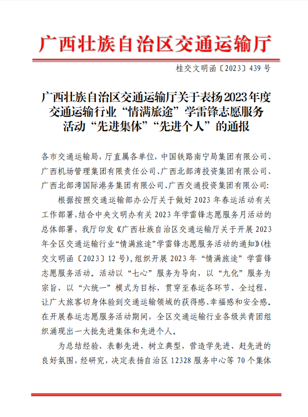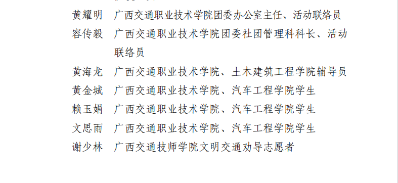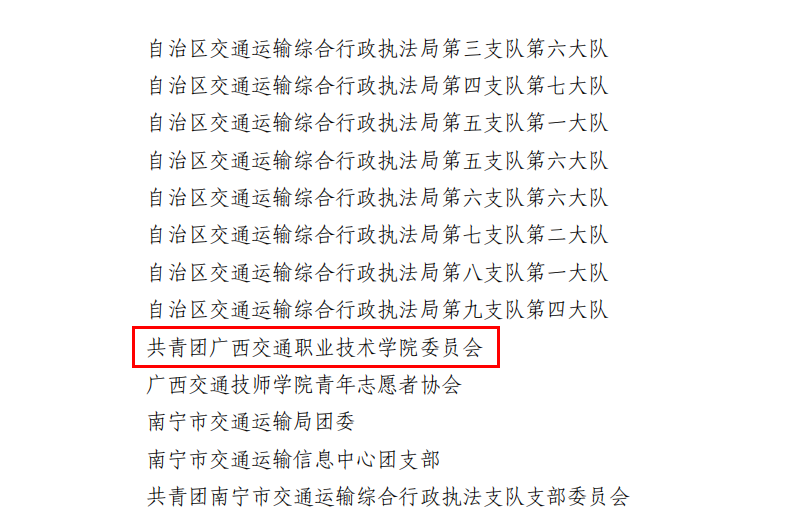(校团委讯 林波/文)近日,广西壮族自治区交通运输厅发布通报表扬2023年度交通运输行业“情满旅途”学雷锋志愿服务活动“先进集体”“先进个人”,校团委连续3年获评“先进集体”,土木建筑工程学院辅导员黄海龙等3位老师、汽车工程学院学生文思雨等3位同学获评“先进个人”。