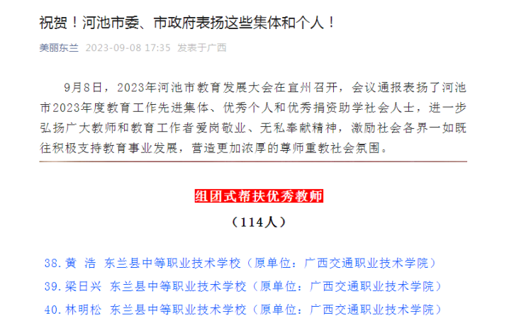 (人事处、教师工作部(教师发展中心) 讯 刘佳嘉、林明松/文)近日,河池市教育局发文通报表扬了2023年的河池市教育工作先进集体和先进个人,PP电子林明松、梁日兴和黄浩三位老师获评“组团式帮扶优秀教师”。