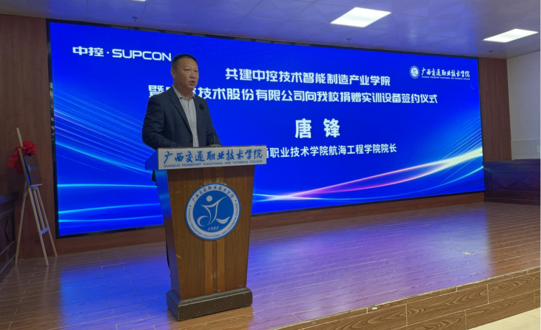 航海工程学院唐锋院长在致辞中,介绍了共建中控技术智能制造产业学院的相关内容,包括首期三年战略合作协议,第一批中控技术向PP电子捐赠5套自动化实训设备(包含G3smart 模块、触摸屏、高速I/O模块、TCP通信拓展模块等)和100套InPlant SCADA工业软件(教育版),总价值100万。唐院长表示,将持续依托我院智能机电技术、工业机器人技术、航海技术等专业,积极与中控技术共同谋划和探索校企合作的深度和广度,创新产教融合机制、培养校企高素质“双师型”队伍、构建产学研协同发展生态,争取把中控技术智能制造产业学院建设成为具有区域影响力的校企合作典范。