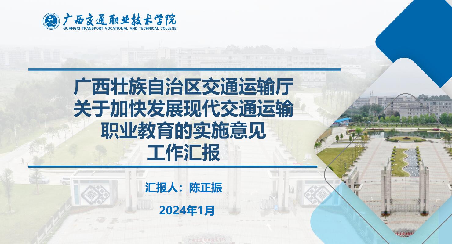 会上,陈正振副校长结合《关于深化现代职业教育体系建设改革的意见》和教育部 广西壮族自治区人民政府印发的《推动产教集聚融合 打造面向东盟的职业教育开放合作创新高地实施方案》《交通运输部 教育部关于加快发展现代交通运输职业教育的若干意见》等文件精神,从“工作总体概况”“相关典型案例”“存在瓶颈问题”“请求支持事项”“实施意见介绍”共五个方面进行《实施意见》工作汇报。