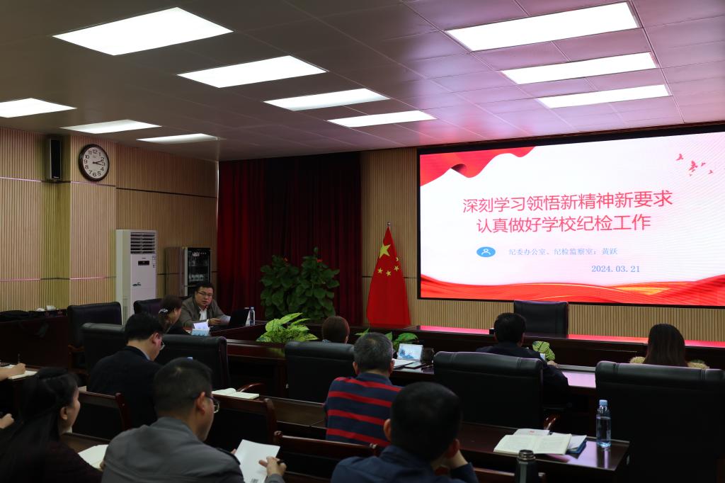 会上,学校纪委副书记黄跃以《深刻学习领悟新精神新要求认真做好学校纪检工作》为题上专题导学。重点聚焦二十届中央纪委三次全会和自治区纪委十二届四次全会精神,从“一、七、八、九”即:一个总要求、七个“要”、八个“突出”、九个“以”关键词高度凝练、深入浅出导学两个全会精神,并结合学校纪检工作实际提出了如何做好新时代学校纪检监察工作的意见建议。