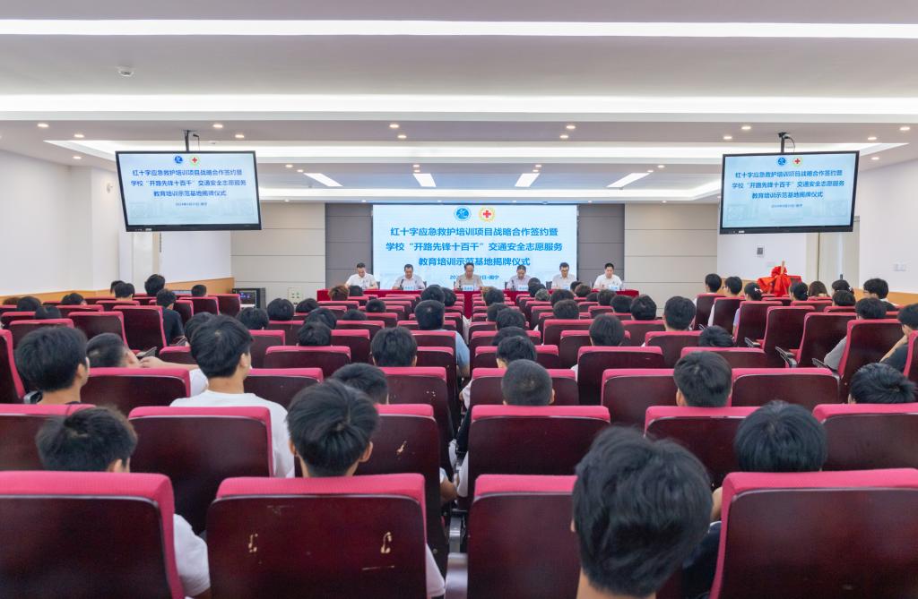 (校团委、路桥工程学院 讯 刘鹏飞/文、图)6月20日,学校红十字应急救护培训项目战略合作签约暨学校“开路先锋十百千”交通安全志愿服务教育培训示范基地揭牌仪式在昆仑校区路桥楼6楼报告厅举行。广西红十字会救助救护部部长蔡云旗,广西红十字会救护训练中心主任周兆元莅临现场指导活动。学校校长李文勇出席活动并致辞。路桥工程学院党总支负责人、学校团委负责人以及150余名师生代表参加活动。