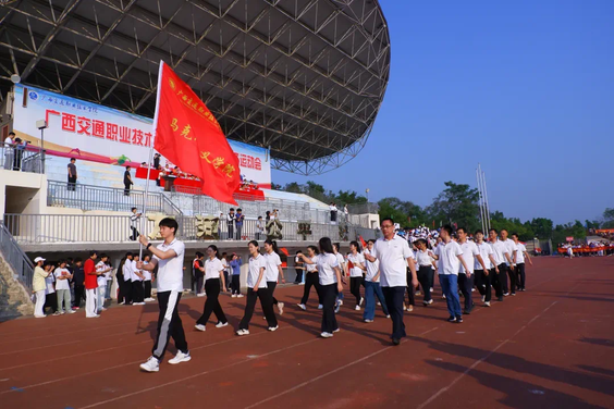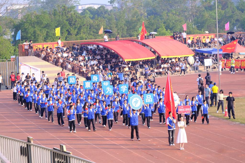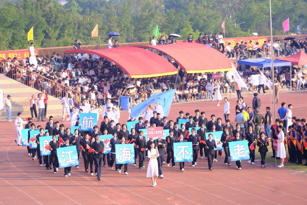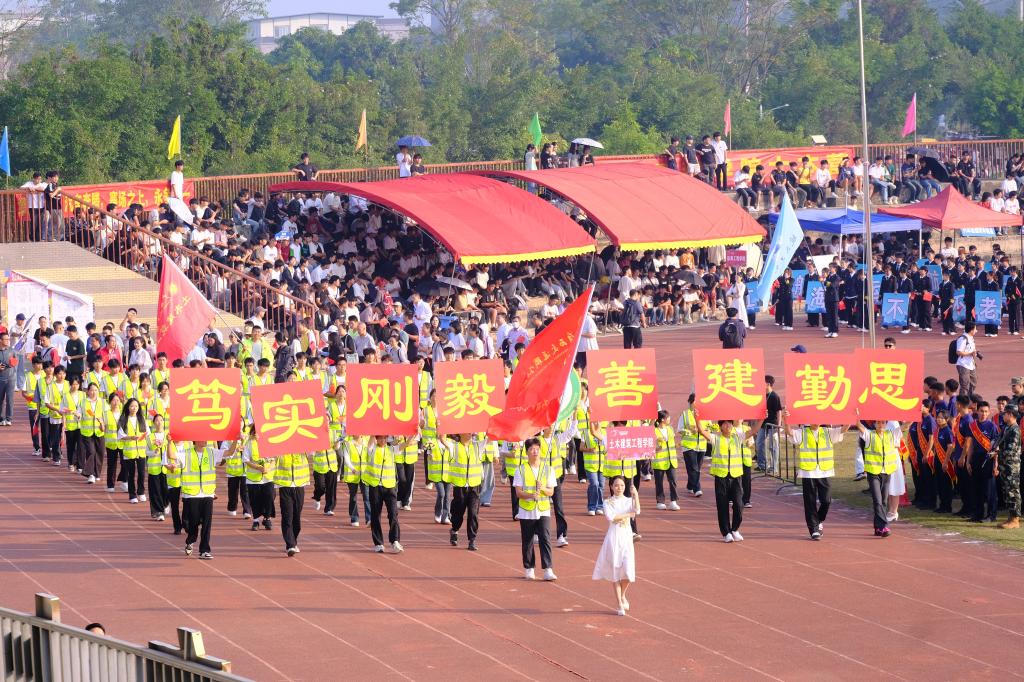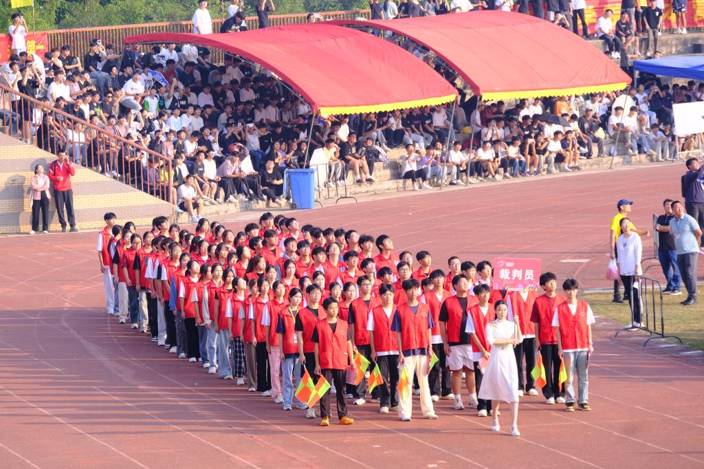 激昂的乐声中,气宇轩昂、英姿焕发的国旗护卫队率先出场,校徽、会标、会旗等紧随其后。他们昂首挺胸,步伐坚定,传递着超越自我、奋勇拼搏的精神。
