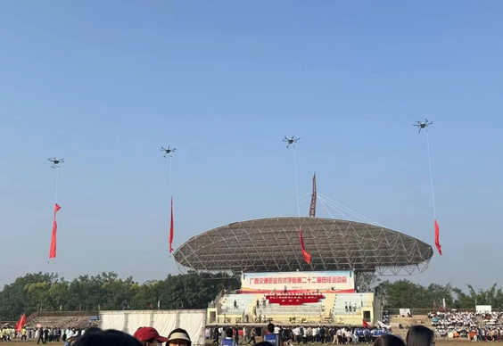 为发展低空经济,企业免费提供飞行表演。在广袤无垠的天空下,一场震撼人心的低空飞行训练团队展演在运动场上方拉开帷幕。那一支支训练有素的团队,驾驶着有人机和无人机呼啸而来,助力田径运动会开幕式。