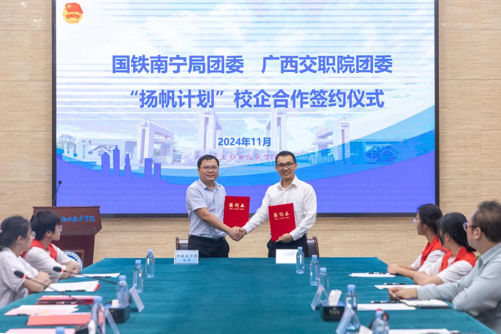 (校团委 讯)11月19日,中国铁路南宁局集团有限公司团委(以下简称“南宁铁路局团委”)、学校团委举办“扬帆计划”校企合作签约仪式,学校党委副书记陈海峰、南宁铁路局团委负责人邓开托出席仪式。
