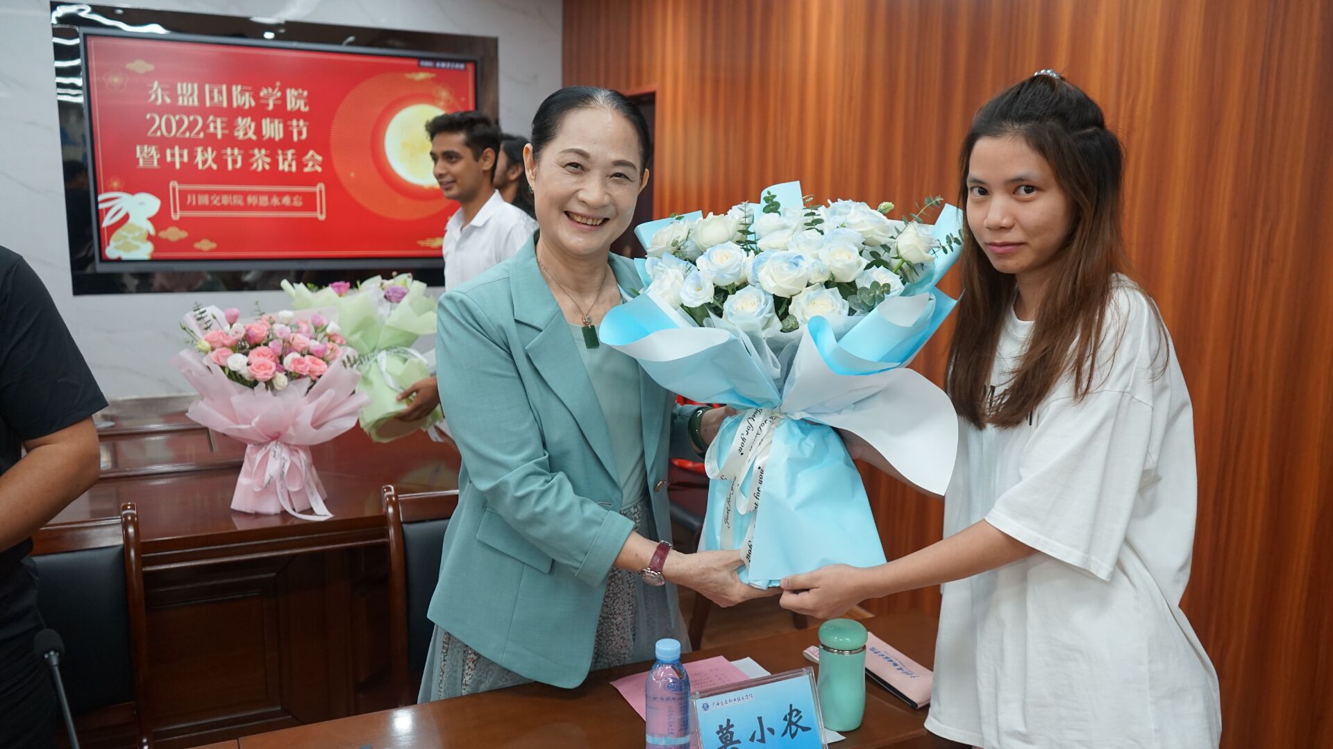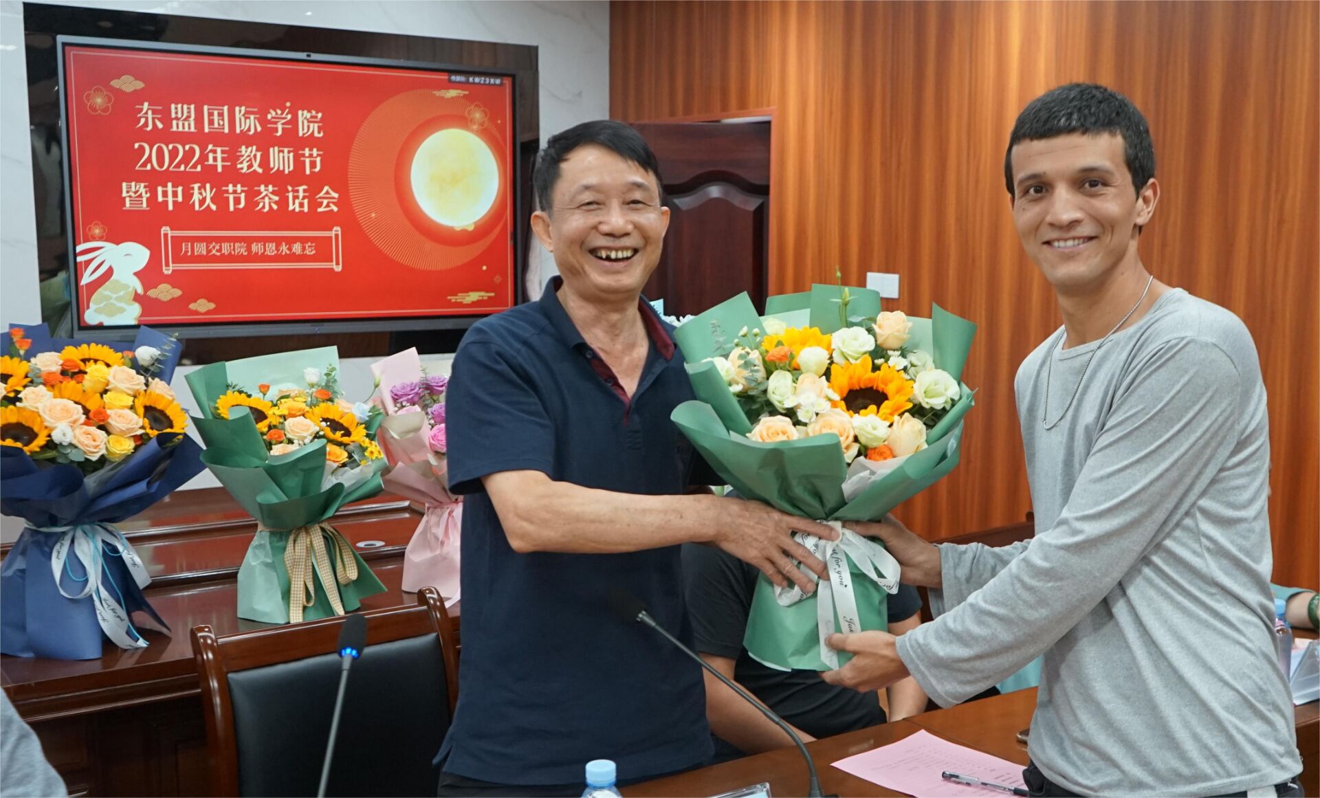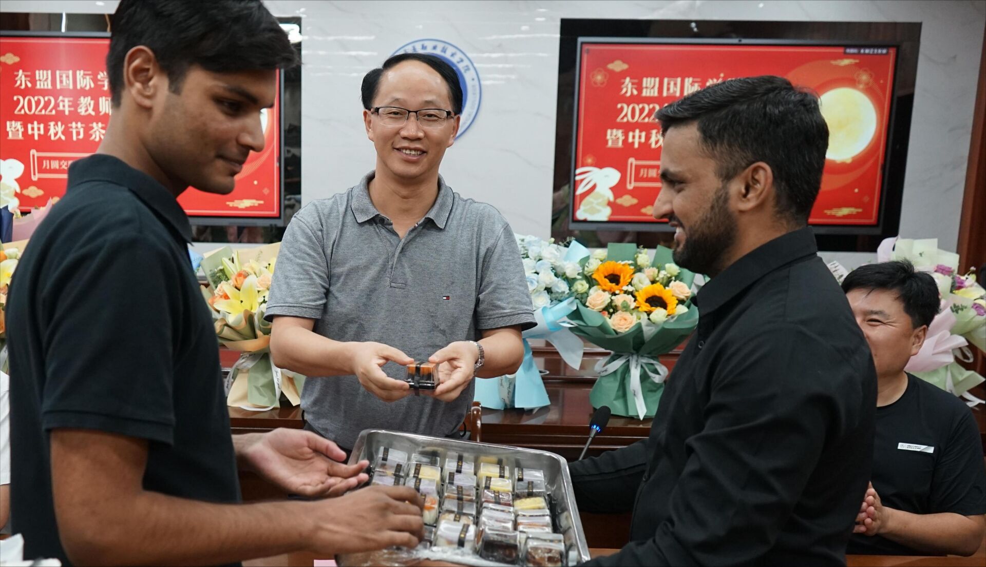 留学生代表苏海尔代表全班向老师汇报了两年来的成长和蜕变。全体留学生表演了配乐诗朗诵《水调歌头》,并向所有与会教师献花,请全体老师品尝了自制的冰皮月饼,师生在茶话会中热烈交流,会议在欢快、融洽的氛围中圆满结束。