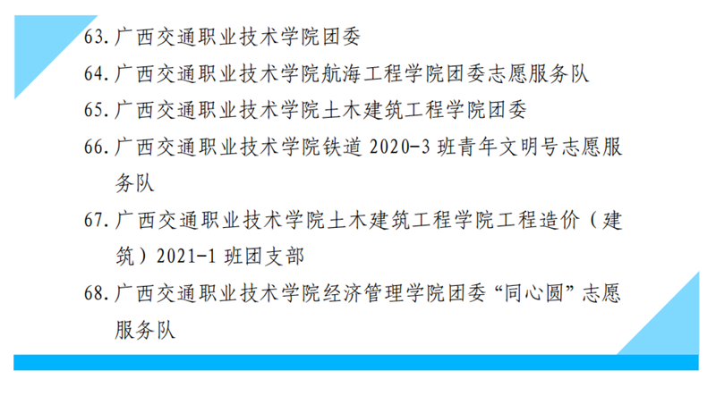 2022年寒假期间,根据共青团广西区委、自治区交通运输厅相关通知精神,学校党委学生工作部、团委和各二级学院依托“桂志愿”“到梦空间”平台,以“情满旅途过暖冬,交通青年争先锋”为主题妥善布置寒假社会实践与志愿服务活动,截止3月5日累计组织动员团员青年参与疫情防控、邻里守望、助力乡村振兴、为奉献者奉献等志愿服务和实践活动6400余人次,累计志愿服务时长超过50000小时,参与入户摸排登记、防疫值守、核酸检测、物资搬运、防疫宣传、防疫宣传、义务辅导等岗位100余个,服务地点涉及广东佛山市、中山市,湖南永州市,云南文山州,广西南宁市、百色市、防城港市等20多个地市,有效引导和帮助广大青年学生上好与现实相结合的“大思政课”,在社会实践与志愿服务中以知促行、以行求知,不断增强“请党放心,强国有我”的思想自觉和行动自觉。5月20日,校团委作为行业代表在学习贯彻习近平总书记在庆祝中国共产主义青年团成立100周年大会上的重要讲话精神座谈会暨2022年自治区交通运输行业共青团工作会议就志愿服务工作作代表发言。