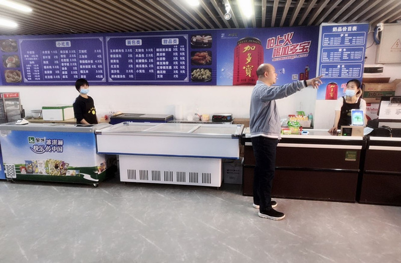 (资产管理中心 讯 宣云/文 韦贵/图)“6月天气越来越炎热,但大家面对师生依然要佩戴口罩,对环境卫生和消毒消杀做到不松懈”。资产管理中心林长峰副主任在检查学校超市铺面疫情防控工作时表示。