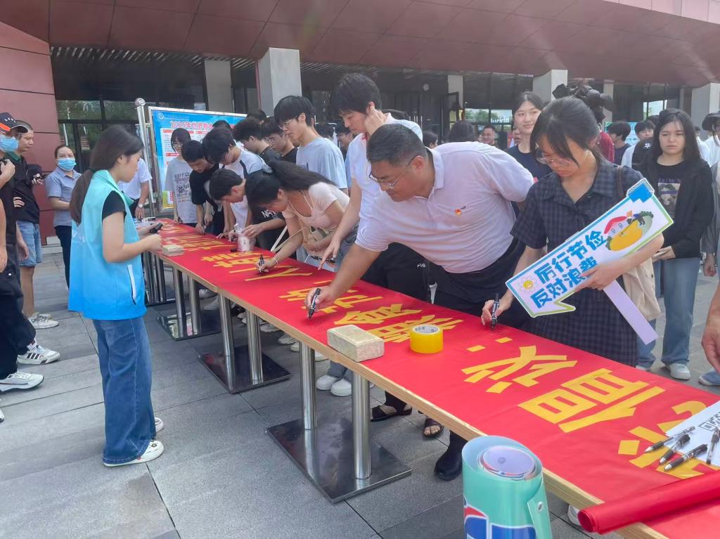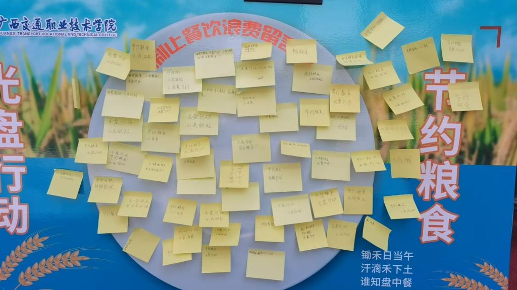 随后,现场师生有序上前,在主题横幅上郑重签名。一旁的“光盘行动”展板前,同学们也纷纷贴上写满心声的便利贴——“谁知盘中餐,粒粒皆辛苦”“民以食为天,食以俭为先”“光盘行动,从我做起”“节约粮食,人人有责”……一句句质朴真挚又发人深省的寄语,传递着师生对爱惜粮食、反对浪费的共同呼唤。