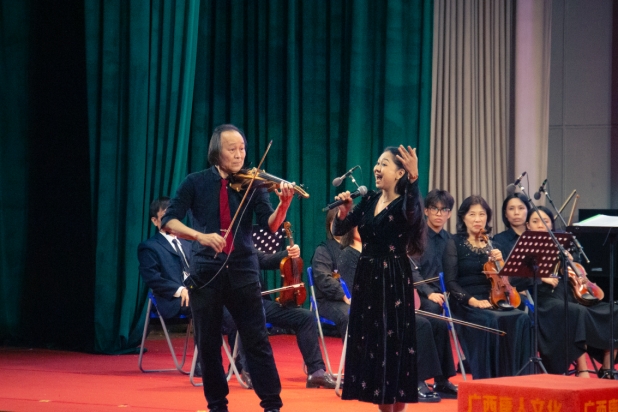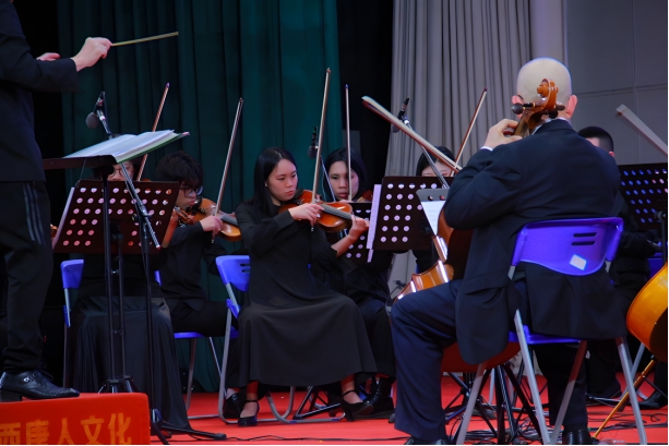 本次活动由学校工会、人工智能学院联合南宁市艺术剧院有限责任公司承办,广西唐人文化爱乐乐团演出。演出活动在管弦乐《激情燃烧的岁月》《织网歌》《丰收》的恢弘旋律中拉开序幕,磅礴大气的演奏瞬间点燃现场气氛,将观众带入激情澎湃的音乐世界。《太阳出来喜洋洋》《茉莉花》《我的中国心》等经典曲目接连上演,或清新明快,或柔美动人,或慷慨激昂,以熟悉的旋律唤起师生共鸣,展现中华优秀音乐文化的深厚魅力。《和谐圆舞曲》《多瑙河之波圆舞曲》《雷电波尔卡》《爱的祝福》等世界名曲的精彩演绎,为师生带来多元艺术享受。整场演出节目编排紧凑、主题丰富,呈现了一场跨越传统与现代、融合民族与世界的音乐盛宴,现场掌声与喝彩声此起彼伏。