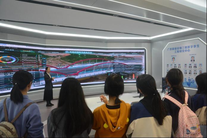 随后,研学队伍来到广西基础设施三维数字孪生工程研究中心。大屏幕上,道路、桥梁等基础设施的三维数字模型实时呈现,配合动态数据监测,展示了数字孪生技术在交通规划、智能建造与运维中的革命性应用;在交旅文创坊和智能建造技术创新工作坊,同学们了解了交通与旅游产业的创新结合模式,以及智能化技术在建筑工程全生命周期管理中的应用;在广西低空交通创新应用中心,无人机飞行演示将研学活动推向高潮,“低空+交通”的智能化应用场景为同学们展望了未来交通的立体化图景。