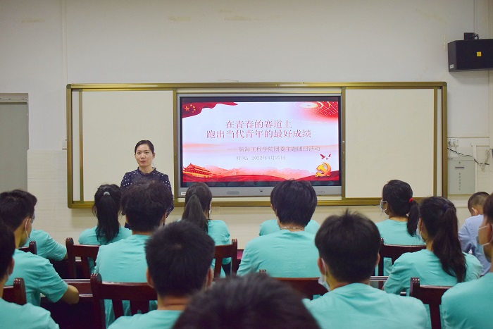 (航海工程学院 讯 黄伟芯、王虎平 文/图)2022年4月27日,航海工程学院团委在相思湖校区401会议室开展“学习习近平总书记在中国人民大学重要讲话精神”之“在青春的赛道上跑出当代青年的最好成绩”主题团日活动,航海工程学院党总支书记林燚宁、团委书记温小珍、团委副书记黄伟芯,水路运输安全管理2021级1班等40多位同学参加了本次活动。