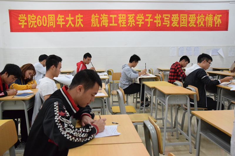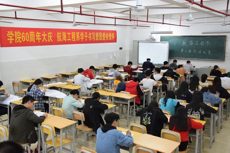 (航海工程系 讯)为丰富校园文化生活,10月24日,航海工程系举办“学院六十周年大庆,航海工程系学子书写爱国爱校情怀”主题书法比赛。