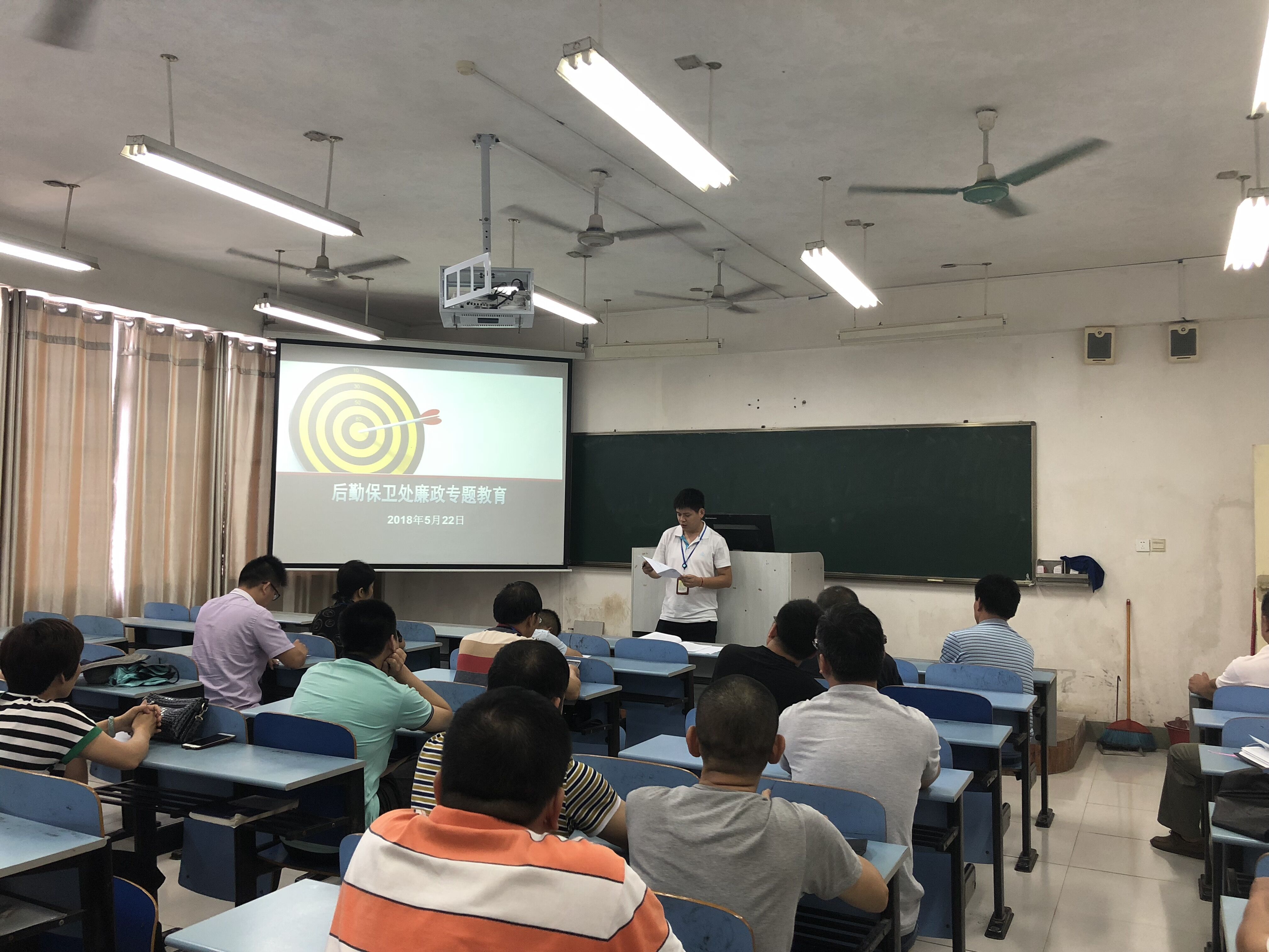 (后勤保卫处 讯) 5月22日,后勤保卫处全体人员在四塘校区综合教学楼A220教室观看了“广西三起县级扶贫办主任严重违纪案件”警示教育片。