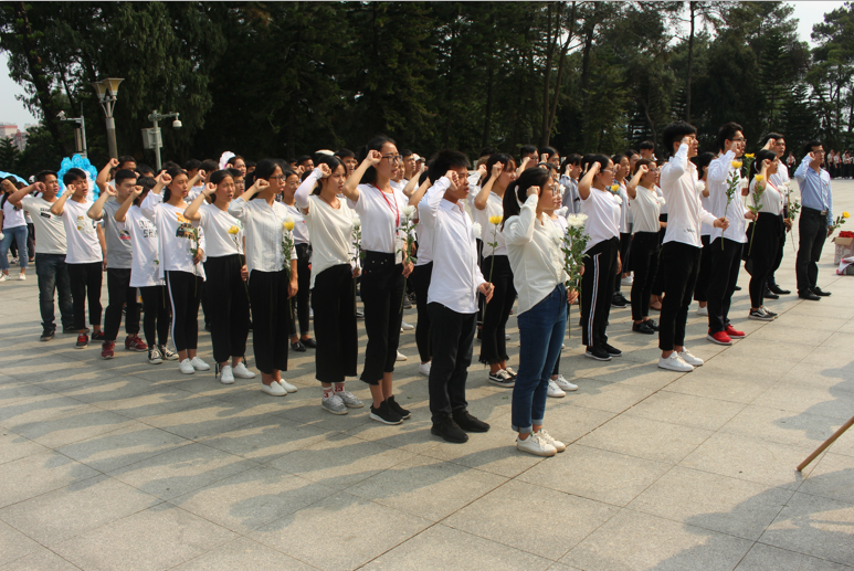 庄严的国歌声响起,祭扫墓园活动正式开始。全体党员师生在英雄纪念碑前重温入党誓词,向革命烈士行三鞠躬仪式、集体默哀,并敬献了花圈和小百花,表达无尽的哀思与敬意。