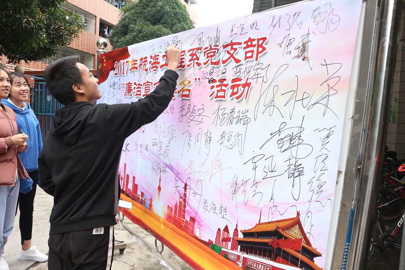 廉洁文化作品展以班级为单位进行。各班高度重视,结合活动方案,紧密围绕廉洁文化教育进行了精心策划。航海工程系各班级共提交廉洁文化作品12部,同学们将个人对廉洁文化的理解融入到作品之中,营造了良好的校园廉洁文化氛围。 同时,航海工程系还组织开展了廉洁宣言签名活动。