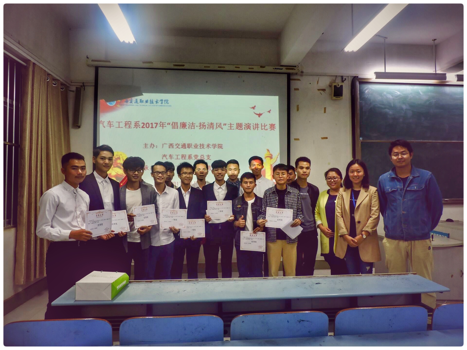 (汽车工程系 讯 吴丹 梁海明/文 付漓漓/图)近日,汽车工程系党总支在四塘校区综合楼B203教室举行汽车工程系2017年“倡廉洁·扬清风”主题演讲比赛。汽车工程系学生党支部教师党员、入党积极分子观看了此次比赛。