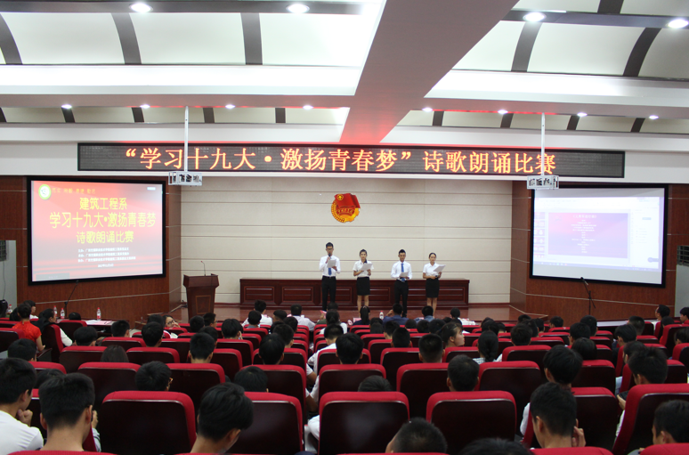 (建筑工程系 讯 黎丽、黄建波/文 汪玥龙/图)11月3日,建筑工程系在四塘校区C1多功能厅举办 “学习十九大·激扬青春梦”为主题的诗歌朗诵比赛。建筑工程系2016级、2017级的21个班级共200余名学生参加了比赛。