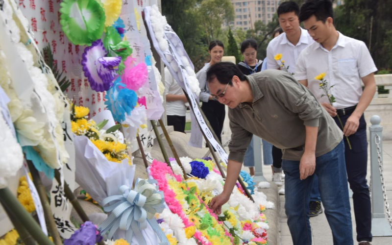 活动伊始,全体师生在英雄纪念碑前宣誓并默哀。接着,全体人员将手中白花敬献在英雄纪念碑前,寄托对烈士的哀思。