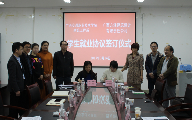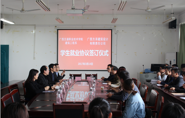 (建筑工程系 讯 李博勤 彭来/文 黄菲菲/图)3月14日下午,建筑工程系与广西方泽建筑设计公司、广西同泽项目管理公司在副楼406会议室隆重举行学生就业协议的签约仪式。学院招就处处长何江霞,建筑工程系主任谢军,广西方泽建筑设计公司、广西同泽项目管理公司副总经理蒋金善、陈燕等人出席了本次签约仪式。