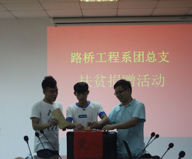 (路桥工程系讯 杨洋、杨静/文 谢廷阳/图)2016年10月17日是我国第三个“扶贫日”,也是第24个“国际消除贫困日”,路桥工程系积极响应学院号召,在教职工及各学生班级中开展扶贫捐赠活动。捐赠款物以现金为主、学习和文体用品等物资为辅。