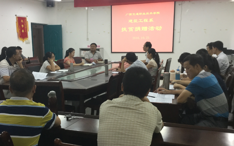 (建筑工程系 讯 范文阳/文)10月25日,建筑工程系在学院副楼406会议室举行了扶贫捐赠活动,全体教职工参加了活动。所得捐赠款物主要用于学院定点帮扶贫困村的生产生活条件改善。