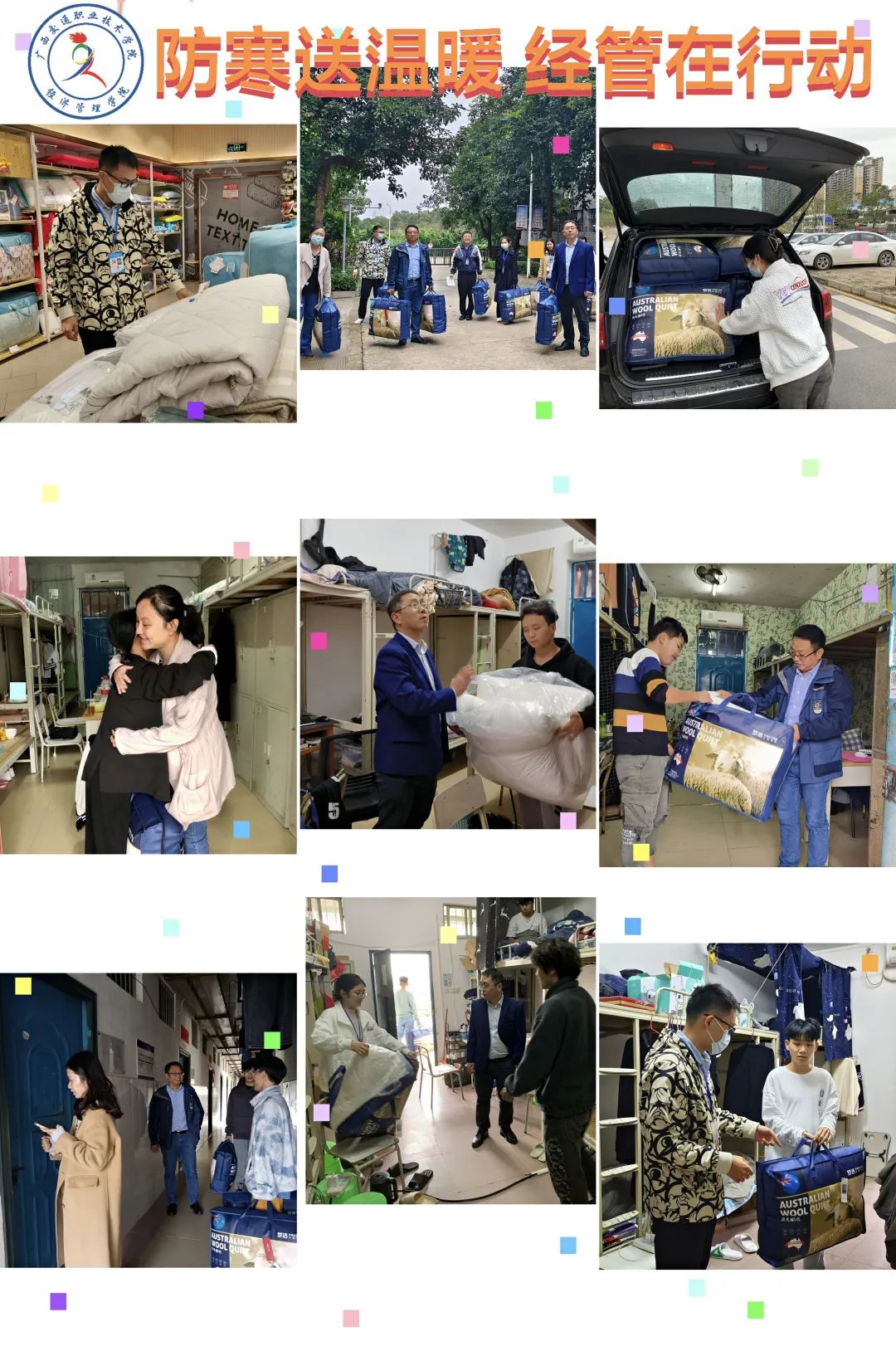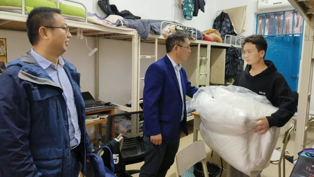 学院党支部书记曹斌、副书记蒋波、学院副院长马赛以及辅导员们,深入学生宿舍,为同学们送上棉被,叮嘱大家要注意防寒保暖。