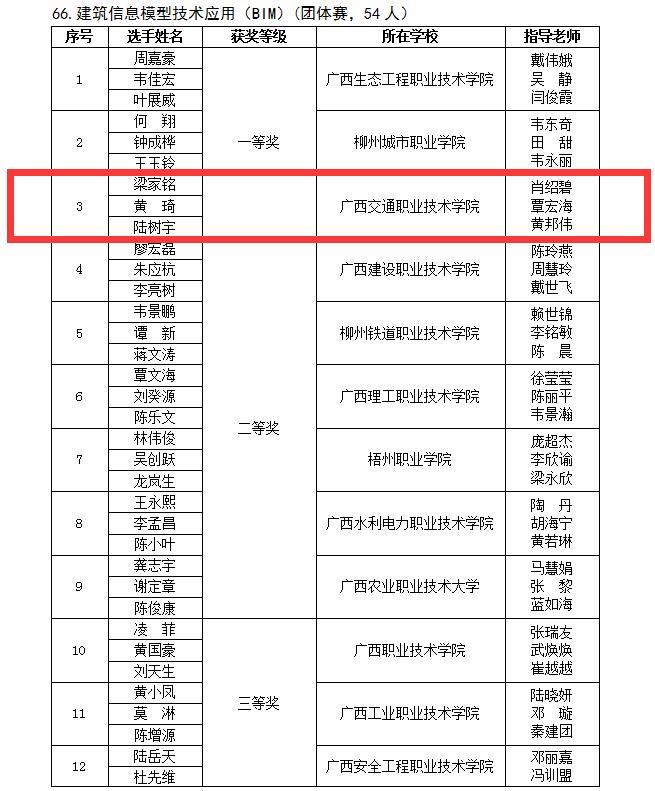 3月18-19日,由自治区教育厅主办,PP电子承办的2023年广西职业院校技能大赛高职组建筑信息模型技术应用(BIM)赛项落下帷幕。路桥工程学院肖绍碧、覃宏海、黄邦伟老师指导的梁家铭、黄琦、陆树宇三名同学经过认真备赛,喜获自治区级团体一等奖。