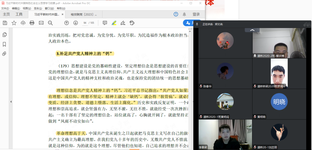 会上,学生第一党支部书记郑文诗老师领学了《习近平新时代中国特色社会主义思想学习纲要》原著中的第十八章第3节——补足共产党人精神上的“钙”,并且鼓励同学们立足岗位就自己如何做到在外跟岗实习做到精神“补钙”发表自己的感悟。