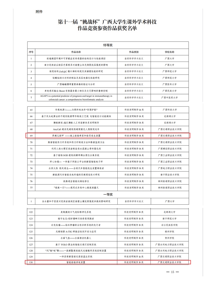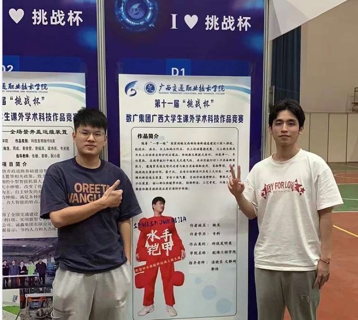 据悉,本届区赛共有来自全区70所院校1473件参赛作品,包括自然科学学术论文、哲学社会科学调查报告、科技发明A类、科技发明B类等多个赛道。经过层层选拔,共有391件参赛作品入围区赛终审决赛。我院由温晓东老师指导的《弄潮儿铠甲 ——海上船舶乘客和船员逃生装置》和王鸿烨老师指导的《智能船舶岸电装置》两个参赛项目均参加科技发明B类赛道,在决赛中双双脱颖而出,载誉而归,分别获得特等奖和一等奖的好成绩,打破了我院在该赛项获奖的历史记录。