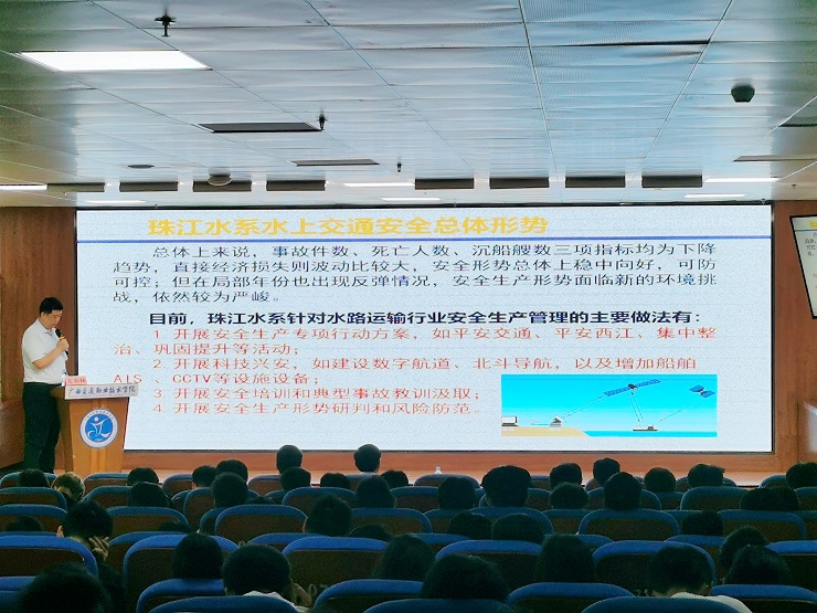 此外,左自林还特别结合2023年全国“安全生产月”及“中国航海日”活动主题,详细介绍了珠江水系水上交通安全总体形势及水上交通安全常识,在知识普及的同时,进一步提升了同学们的海防意识和安全理念,厚植航运文化。