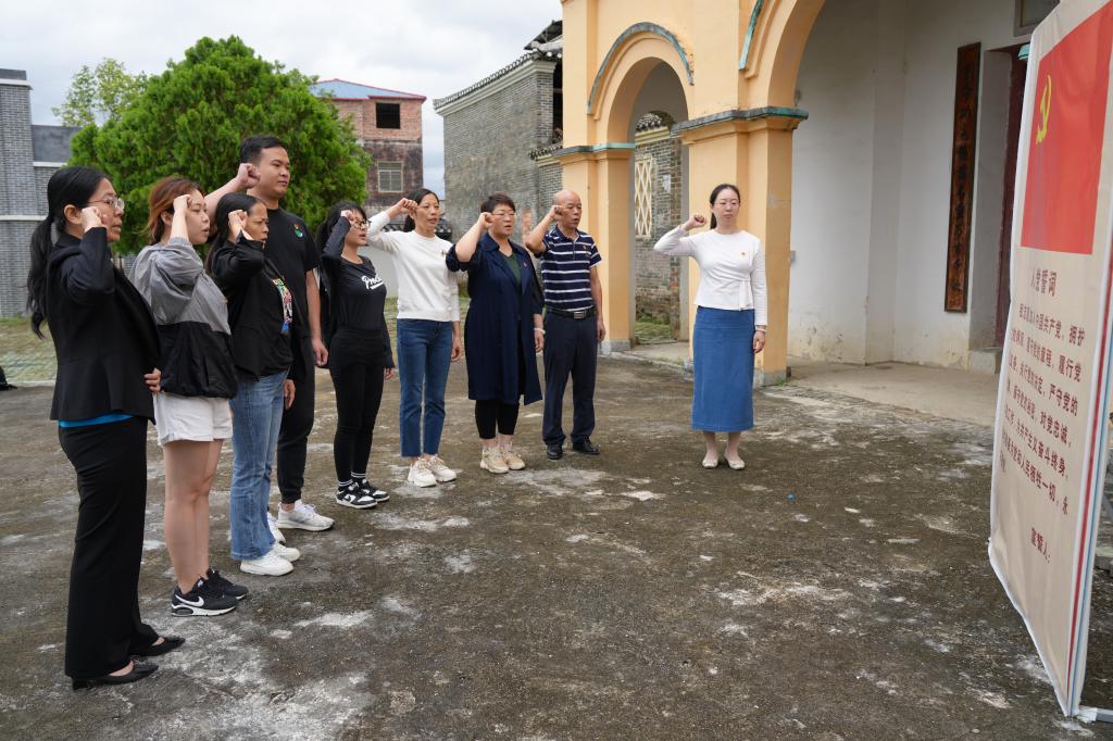参观结束后,党支部书记梁金江同志在南陔革命旧址内的教室里为党员们上了一堂生动的党课,课后于南陔革命教育基地前,党员们面对党旗,举起右手庄严宣誓,重温入党誓词“我志愿加入中国共产党,拥护党的纲领,遵守党的章程,履行党员义务……”,宣誓声慷慨激昂,振奋人心。