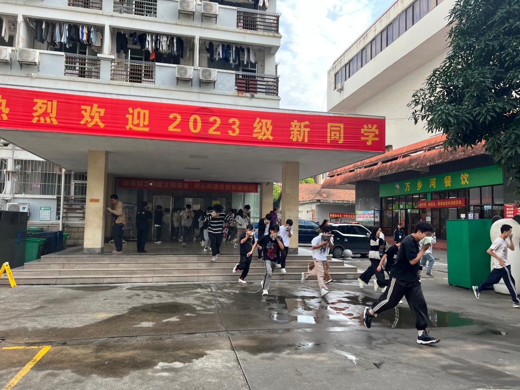 接着,进行的是消防疏散演练。新生们在保卫部老师和各二级学院辅导员的引导下屈身弯腰、用衣服或帽子掩住口鼻,沿着安全通道路线迅速撤离至安全地点。
