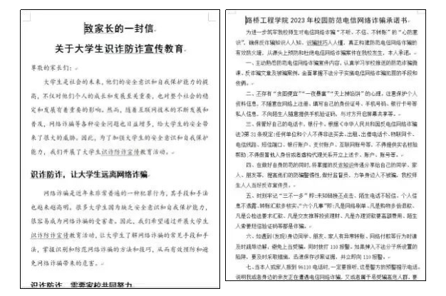 学院给所有在校学生下发防诈骗告知书、给家长的一封信,加强家校联系,与学生家长共同引导学生树立正确的价值观念,教育他们自觉抵制电信诈骗,掌握必要的防范技能。