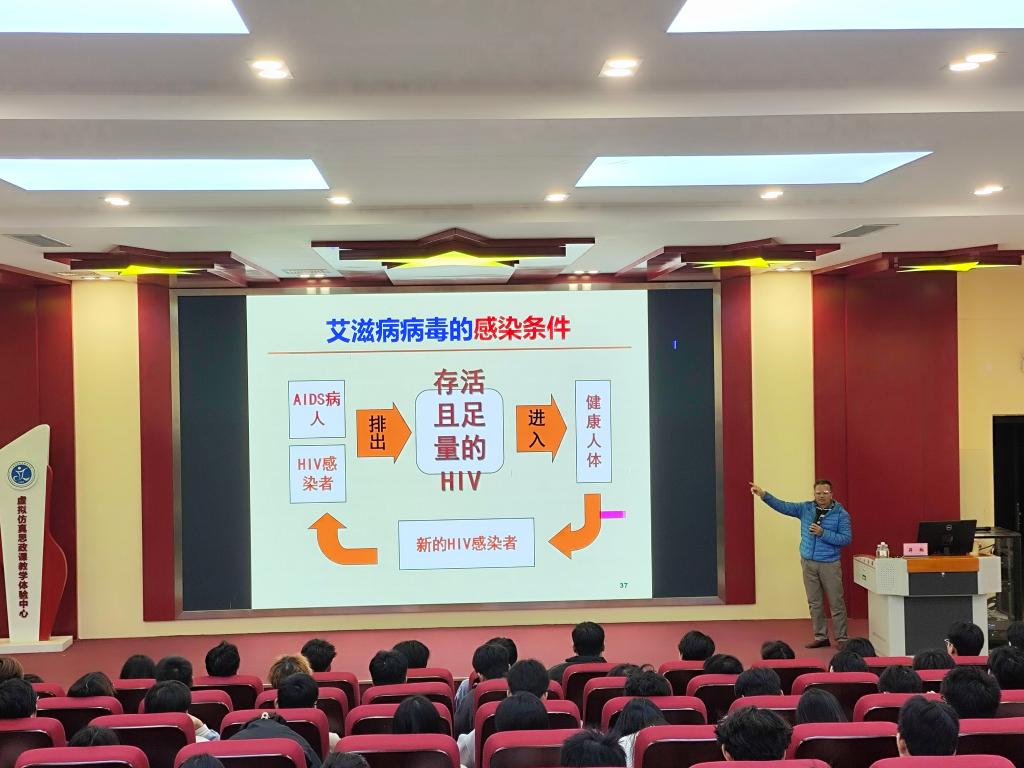 蒋教授从健康中国促进行动的意义、国内外与广西艾滋病流行现状、预防艾滋病的重要性等方面做了详细介绍,重点讲解了艾滋病的危害、病毒的传播要素、传播途径以及全球艾滋病的防控形势,通过生动形象的语言、图文并茂的方式,让同学们对艾滋病的特征、防治有了更深入的了解。