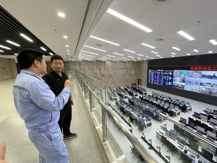 在上海华谊集团的二级公司广西华谊新材料有限公司,曾副院长与仪控专家交流华谊钦州化工新材料一体化基地一期、二期运行情况,了解企业用工需求、校招形式、岗位技能要求等,并结合学院中控技术智能制造产业学院建设目标,了解“中控技术×广西华谊能化:打造世界领先的数字化灯塔工厂”项目,“数据+工业互联网平台+智能工业APP”系统架构运行模式,现场感受智能制造真实应用场景,挖掘校企合作,建立企业导师模式,推动学院产业学院建设取得新成效。