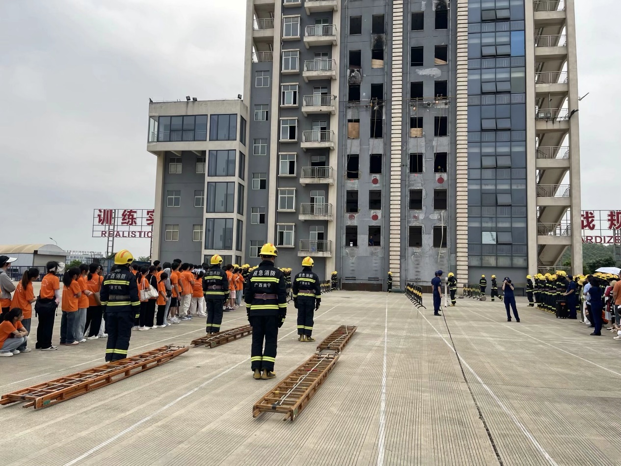 (后勤保障服务中心讯 高长亮/文、图)4月28日,后勤保障服务中心副主任李锦率队走进广西消防救援总队与战勤保障支队训练基地参加“训保开放日·百业千行万人进训保”主题观摩教育活动,学习消防安全知识和消防技能。后勤中心全体党员、春雨协会及义务消防队学生代表、物业代表、食堂代表、部分实训中心学生代表共计120人参加此次活动。