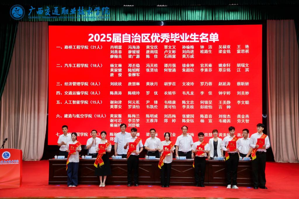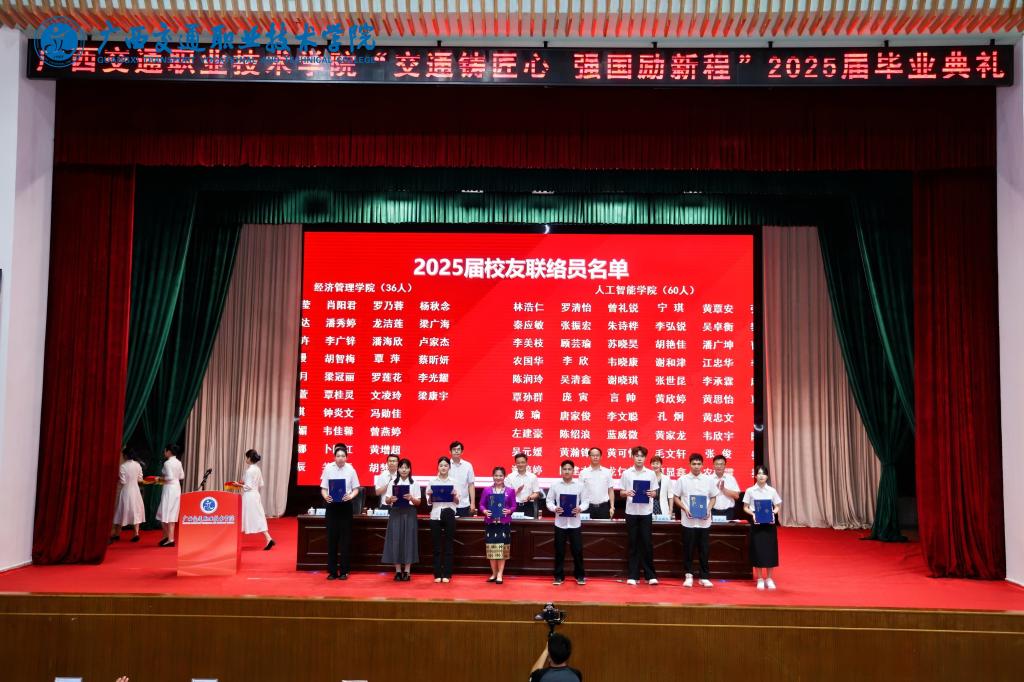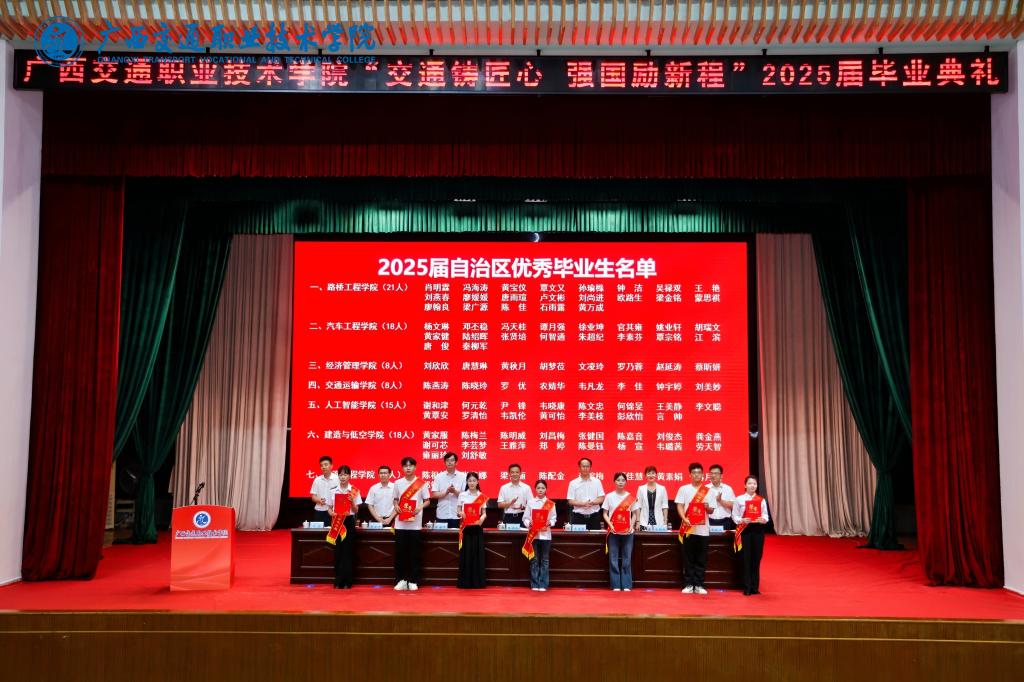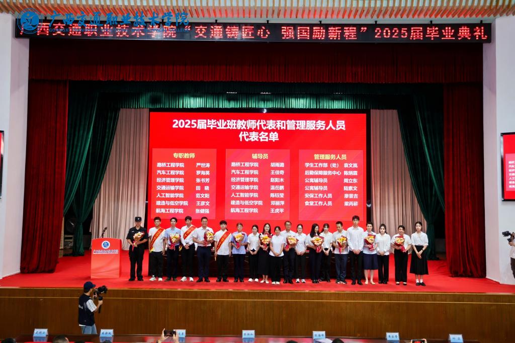 路桥学院2007届毕业生、全国交通运输系统劳动模范张文作为校友代表致辞,他结合自身奋斗经历,勉励毕业生锤炼吃苦耐劳品质,在艰苦奋斗中磨砺意志、积蓄力量;勇担时代使命,以拼搏精神迎接挑战、把握机遇;扎根八桂大地,以自强不息的精神建功立业,奋力在交通建设的主战场绽放青春光彩。