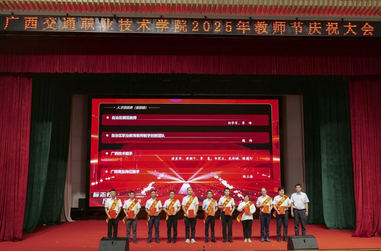 (党委办公室、宣传部 讯)9月10日,学校在园湖校区大礼堂举行2025年教师节庆祝大会。自治区交通运输厅党组成员、副厅长陈津维,自治区交通运输厅科教处处长韦红教,学校党委书记陈湘如,党委副书记陈海峰,党委副书记、纪委书记麻新桃,副校长黄云奇、戴晓云、邱实出席庆祝大会,全校教职工参加大会。